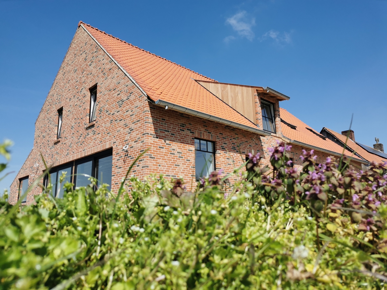Het centrale deel van de woning bevindt zich in de zitruimte en keuken. Die ruimte kijkt volledig uit op het terras over de waterput en op de speelweide.