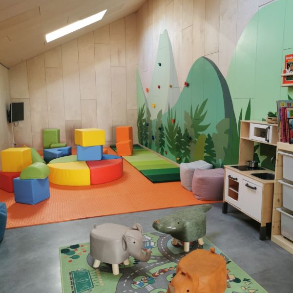 Deze actieve kamer naast de leefruimte bevordert de motoriek van de kleinsten en geeft een uitdaging op de klimmuur voor de durvers. Een gezellig hoekje om een boek te lezen of om naar hartenlust te spelen.
